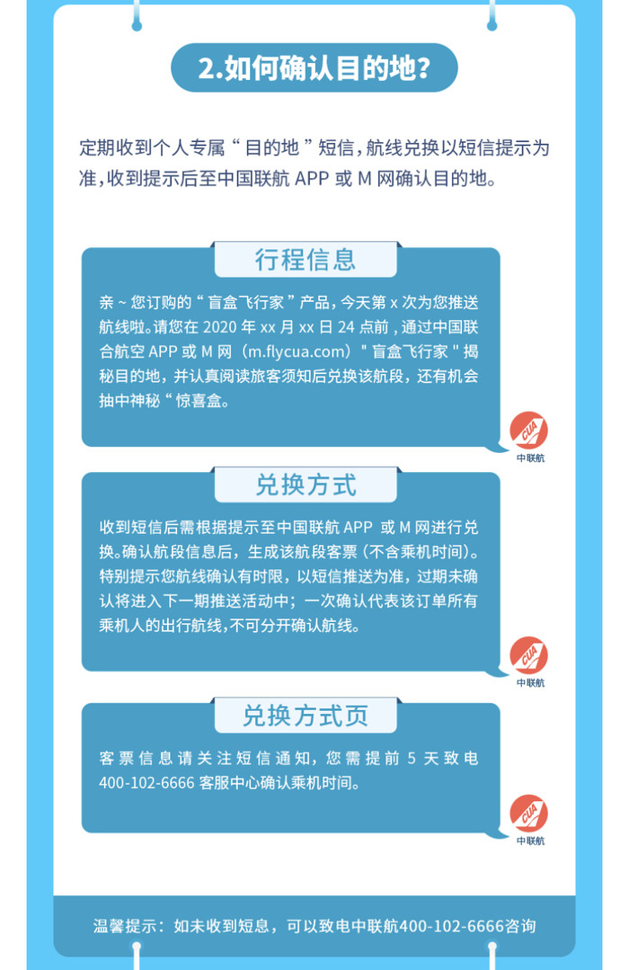每周推送的航班,对应旅行时间范围如下,具体有效期以收到的短信为准。旅行时间排除了五一,(承运周期即为旅行时间)