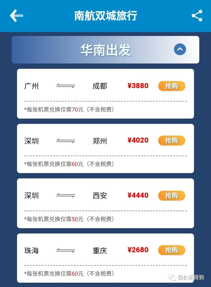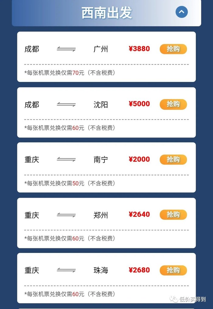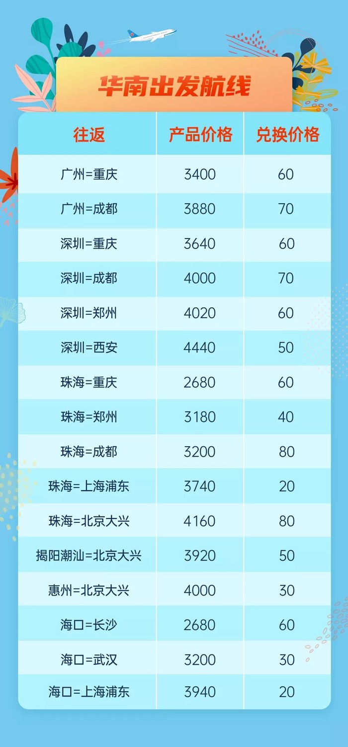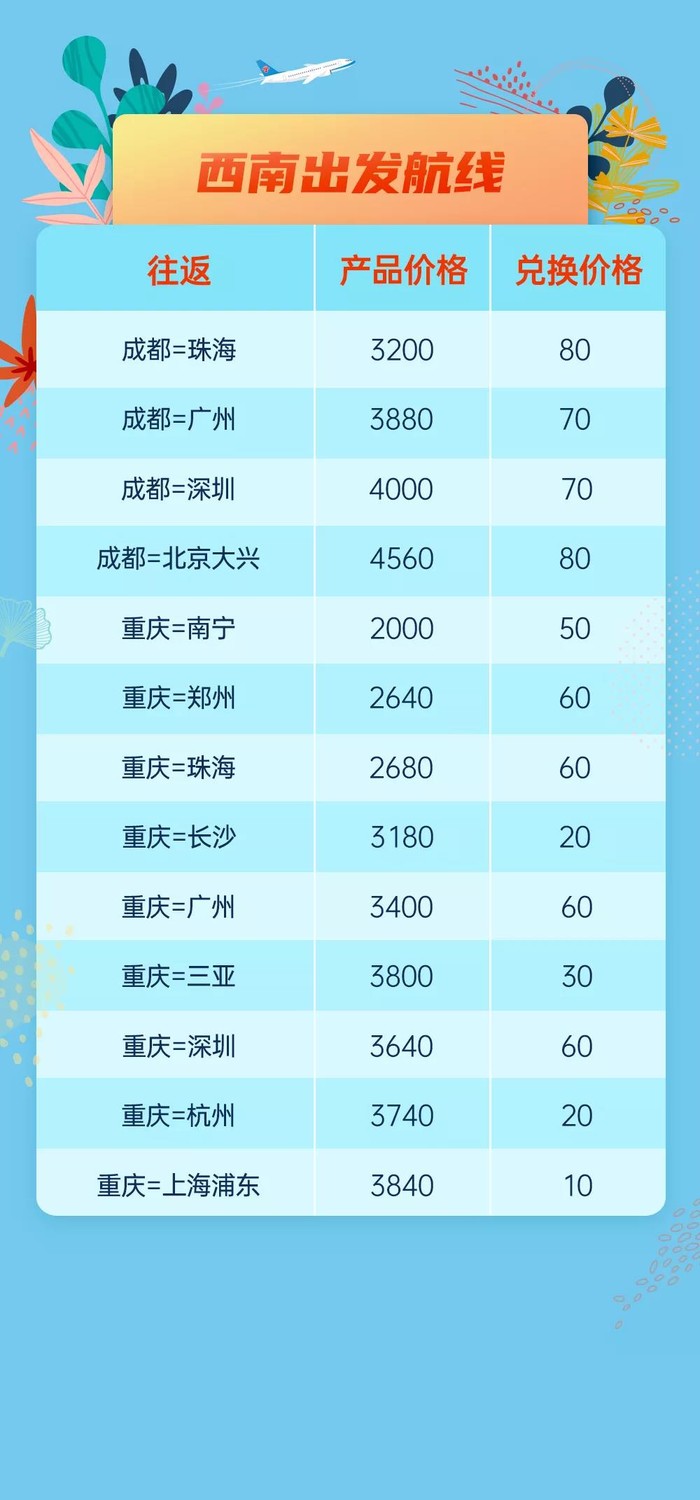 比如以下是西南、华南出发,部分航线的价格。比如你花3880元买了成都往返广州的套票,就能在规定时间内,不限次数,花70元兑换成都广州之间的单程机票(50元税费另算)。
