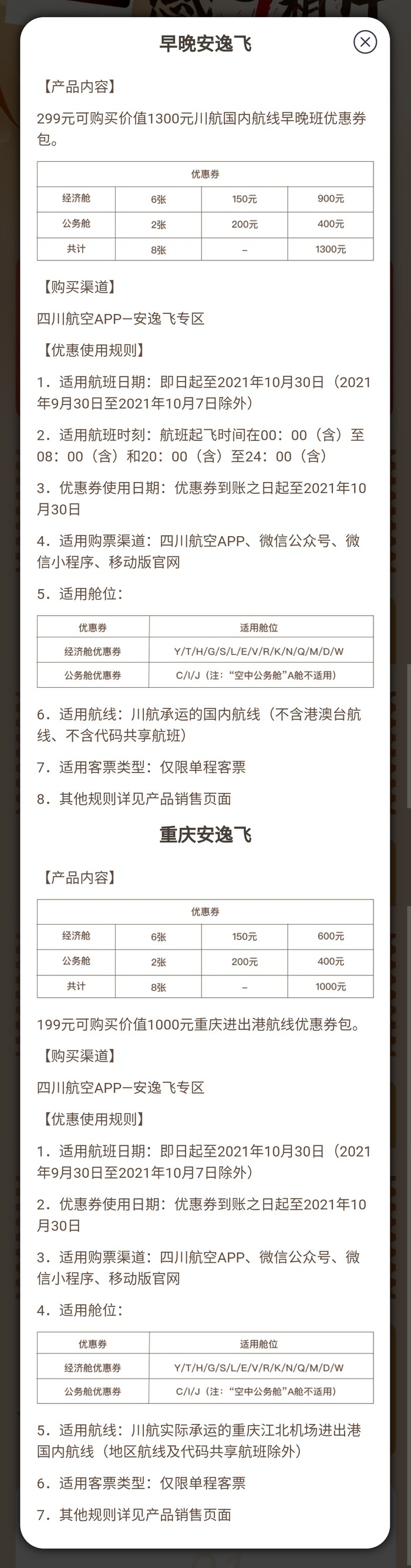 川航“安逸飞”是一款卖机票优惠券的产品,具体规则如下。