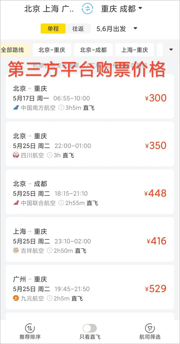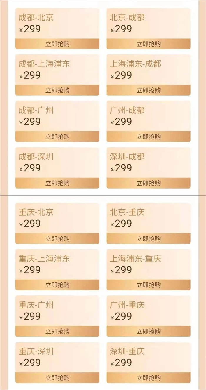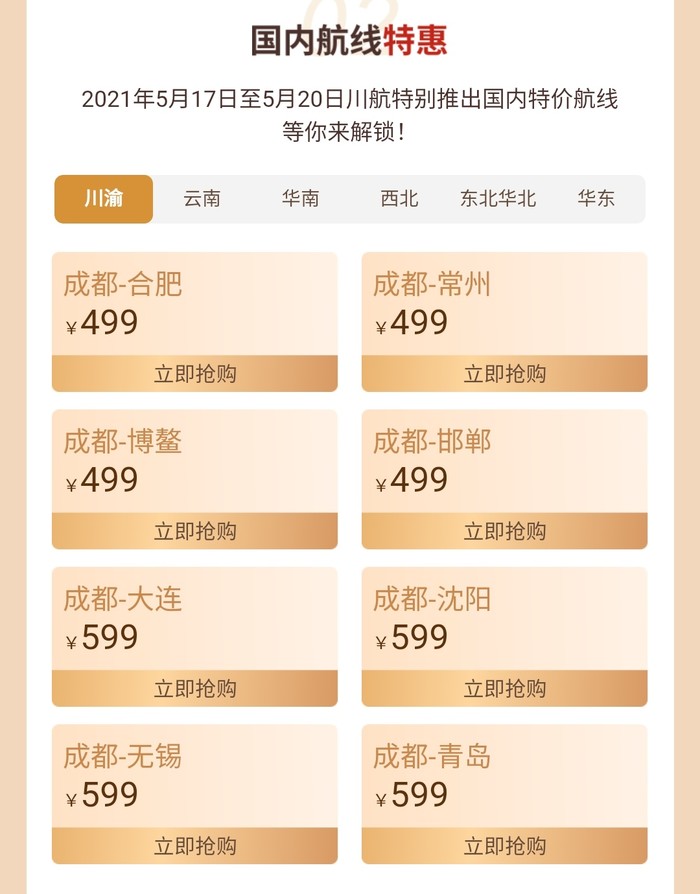 除了北上广深川渝,到时候其他国内航线川航也有特惠,但我看了看,力度不大。