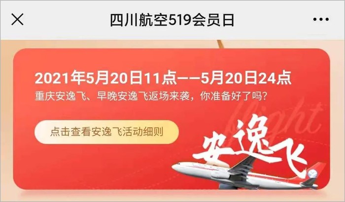 每周四上午11点,“安逸飞”产品都会在川航APP销售。下次开卖是5月20日11点-24点。