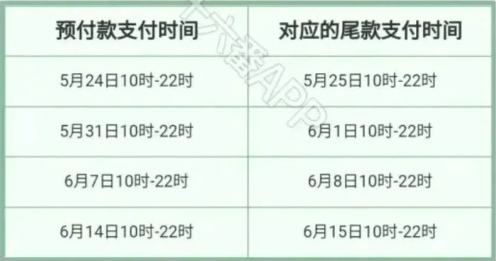 购买时间:5月24日-6月15日,每个星期一 10点-22点,付20元预付款;每周二10点-22点付尾款。每周限1000套!!!预计会很难抢的。
