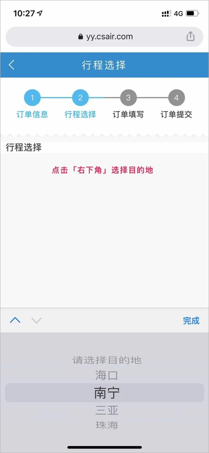 登录后(手机网页),最终会来到这个页面,可以看到自己的出发地有哪些目的地供选择。(南航每次更新的目的地有好几个)