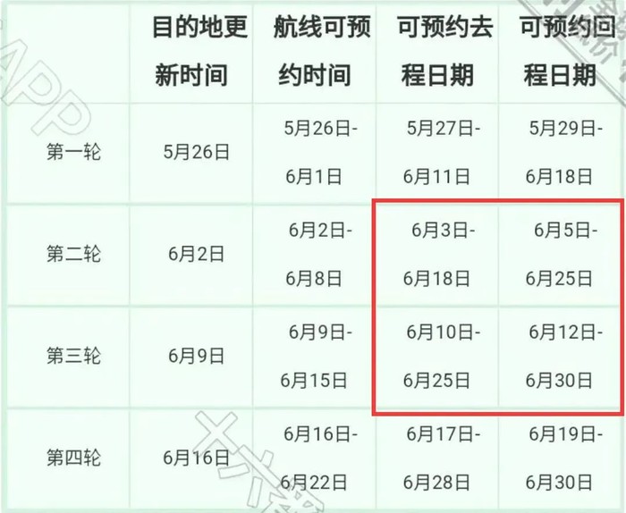5月26日 10点开始,可以兑换机票。每轮航线更新时间、可预约时间对应如下表。