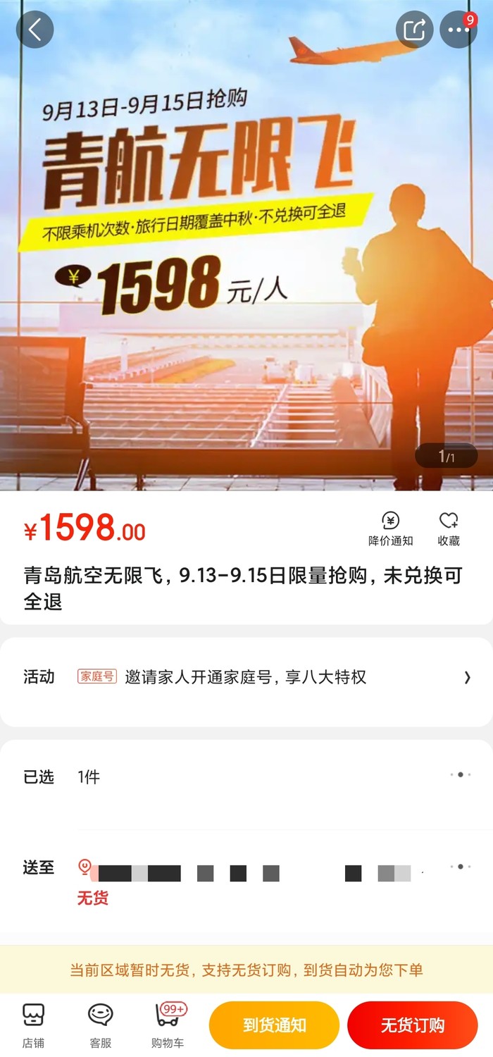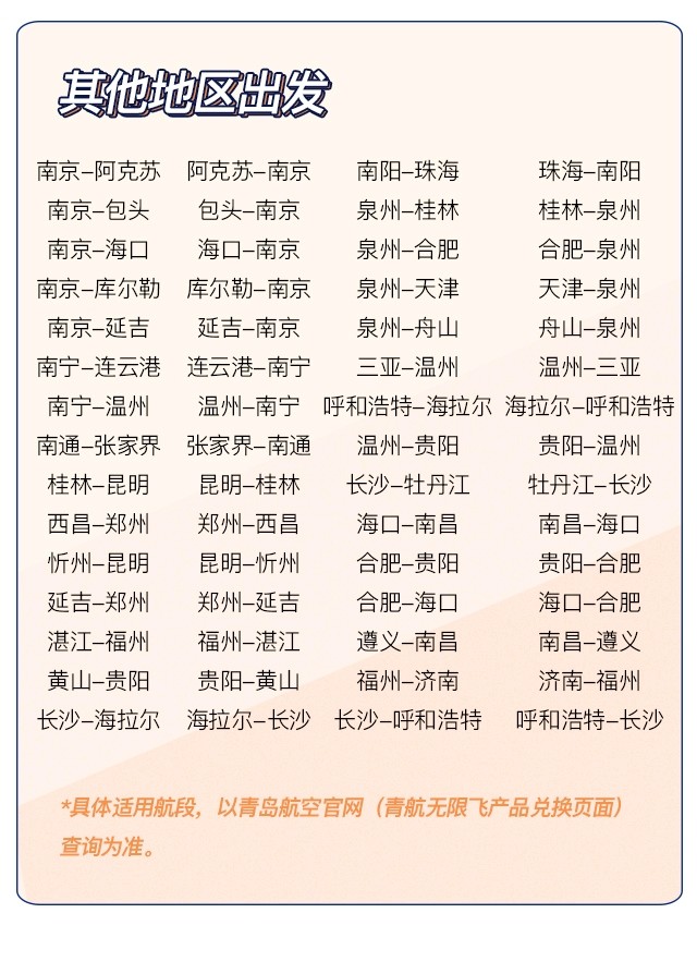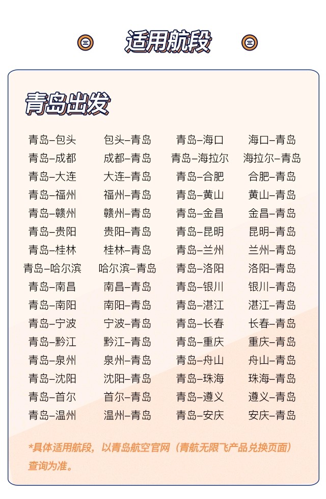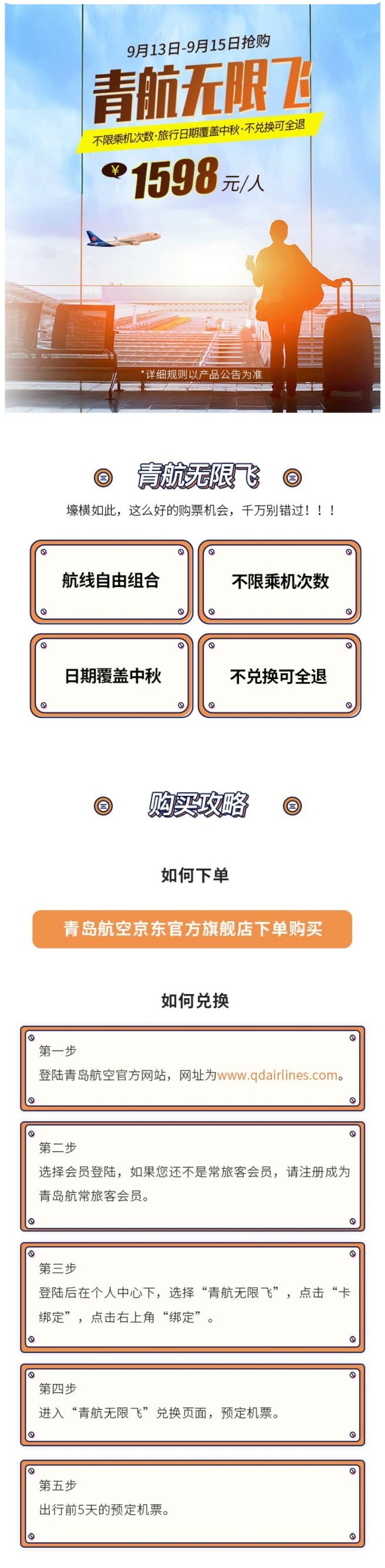 1598元/人,青岛航空无限飞,9.13-9.15开卖,青岛航空实际承运航线不限乘机次数(排除了部分航线)。