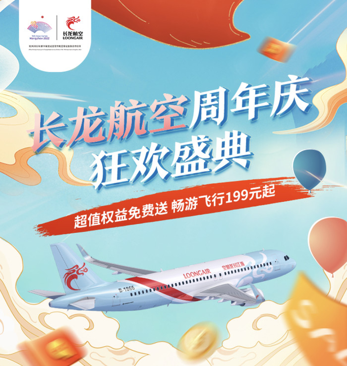 长龙航空周年庆,分为机票优惠券、199元飞行次卡、特价机票等几个活动。