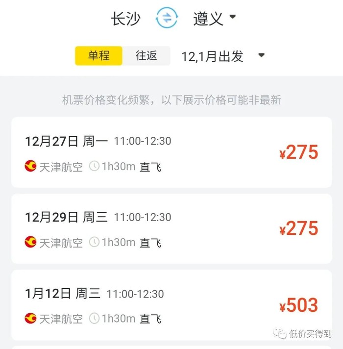 比如长沙-遵义单程,秒杀价99元,就非常划算。在第三方平台直接购票的话,单程价格270元起。