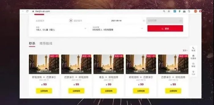 进入天津航空官网,就能看到下边这个秒杀模块,登录会员后,点击“更多”,可查看全部秒杀航线,看到合适的航班与日期,即可购买。