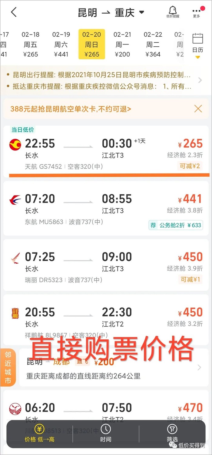 在第三方平台直接购票,同一天,最便宜票价265元,但航班时间在深夜,天津航空执飞不含免费行李托运额。稍微换个时间,票价就在440元以上了,比388元贵。
