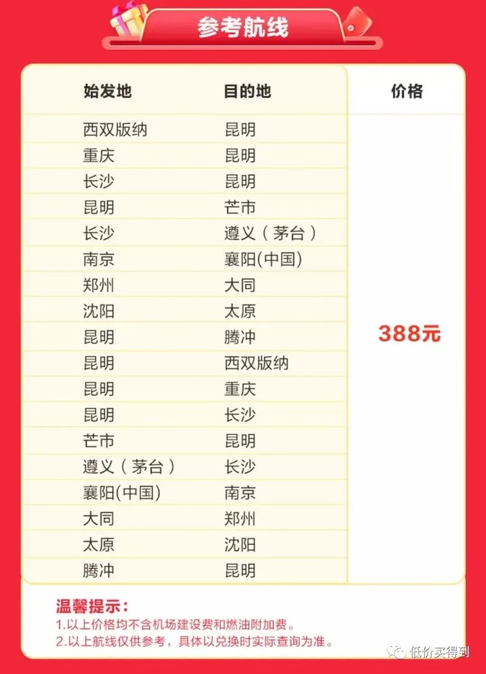 昆明航空返乡次卡,每套次卡可兑换单程机票1张,根据可兑换的航线范围不同,分为388元、488元、588元三个价位,50元税费另付,含20kg行李托运额。