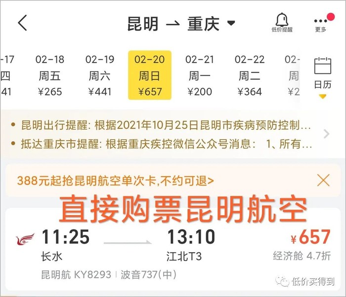 以2.20昆明飞重庆为例,如果用昆明航空返乡次卡兑换,票价388元。