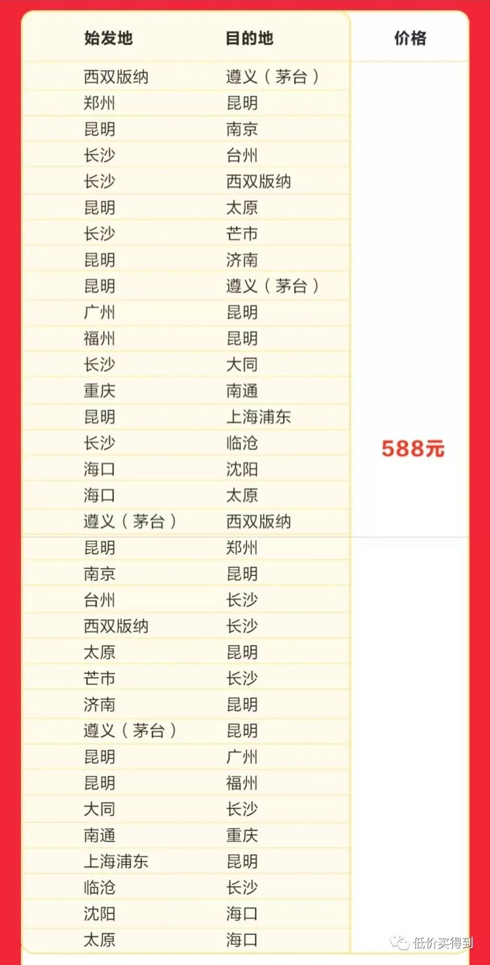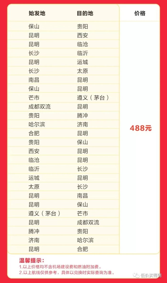 每个价位适用的参考航线如下: