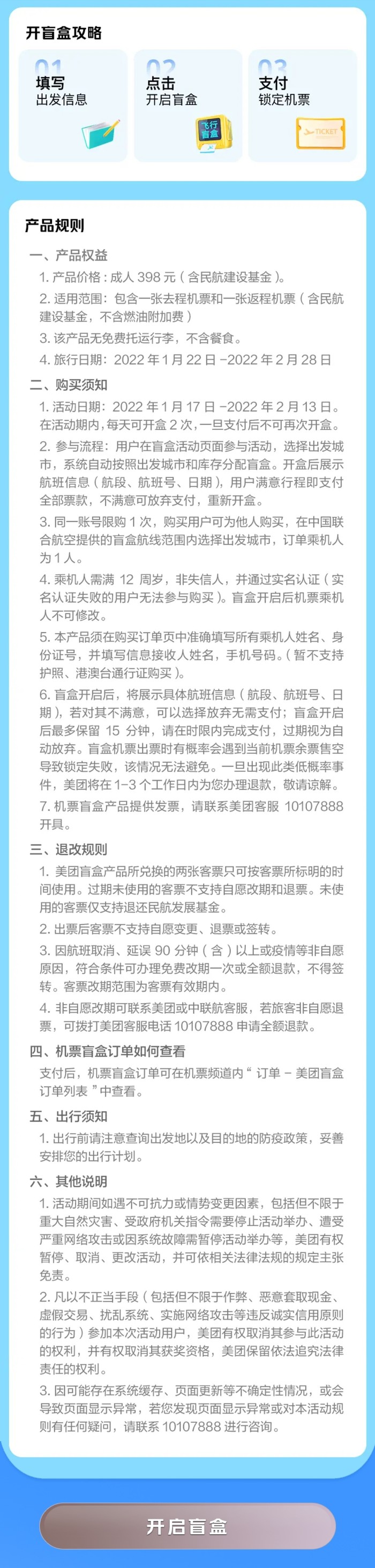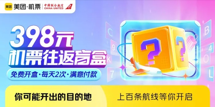 中国联合航空在美团上推出了一个机票盲盒,含税398元(税前298元)飞往返,有几十个出发地可选,目的地随机更新。按照页面介绍,是免费开盒,满意再付款。