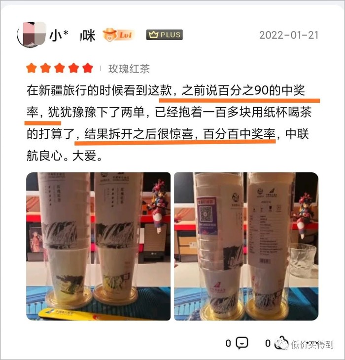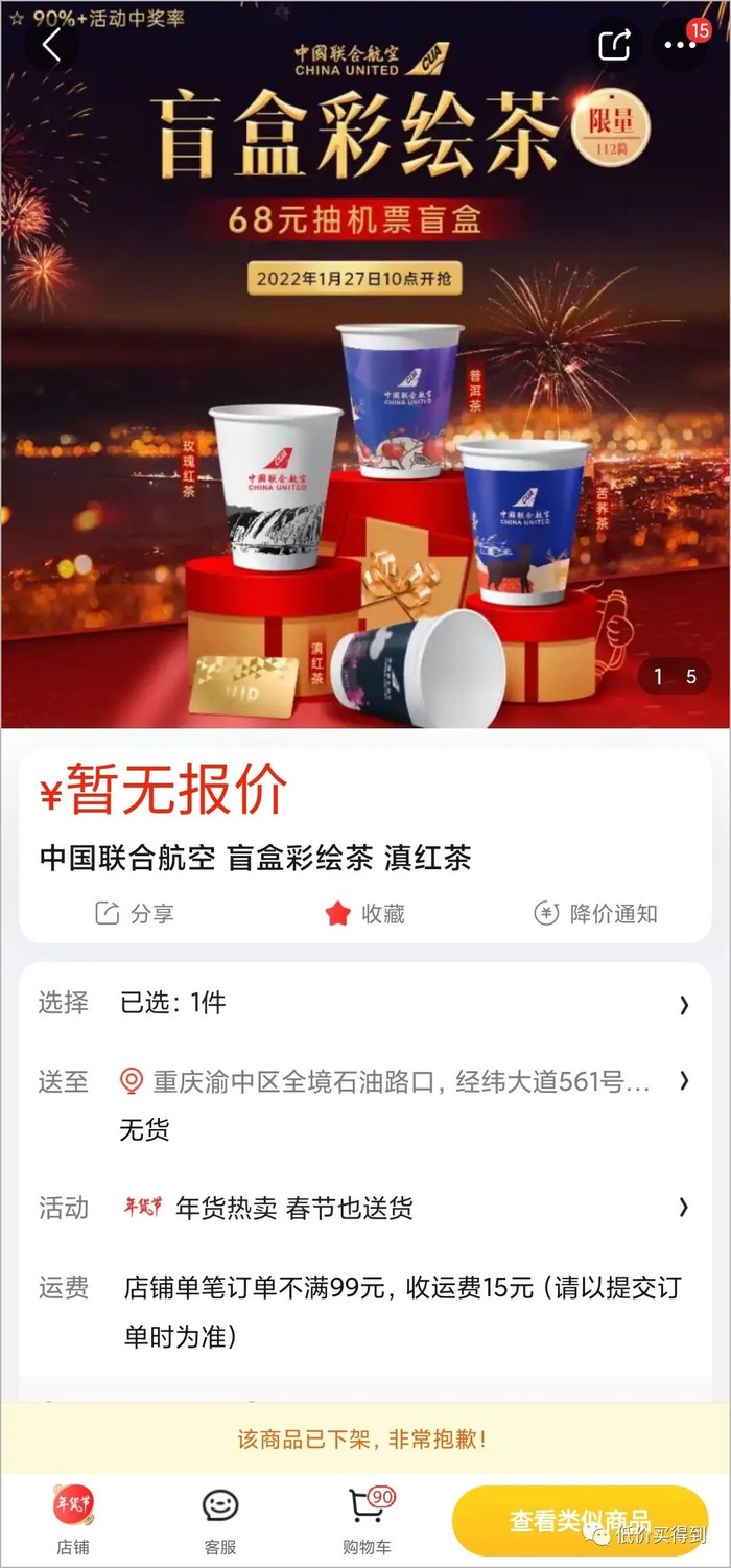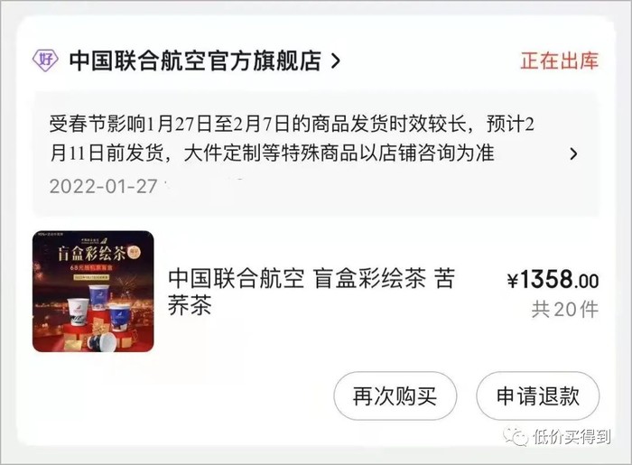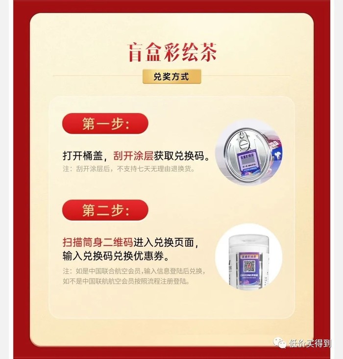 京东APP-中国联合航空旗舰店推出的活动(目前暂已售罄,不确定是否补货),68元买1筒茶(10杯/筒)。刮开桶盖上的兑换码,有极大概率兑换1套“随机飞”产品,就相当于68元兑1套往返机票了(税费另付)。