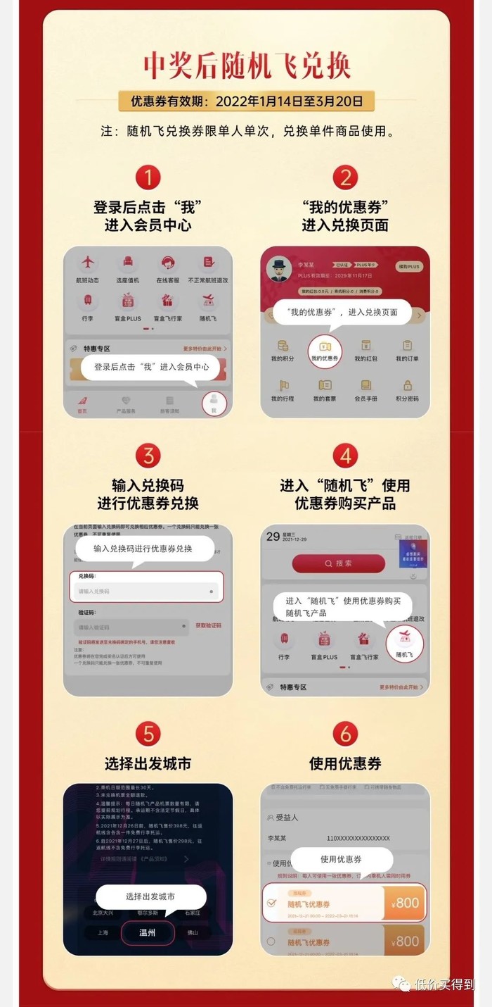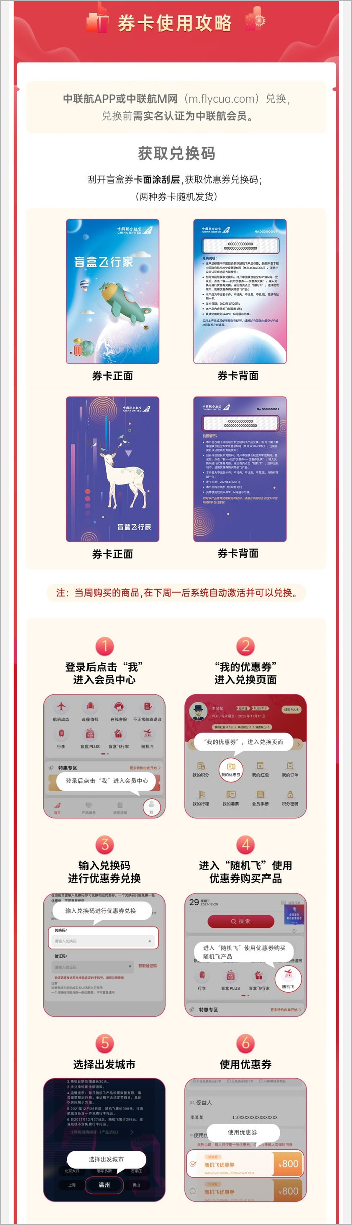 使用方式是这样的:刮开兑换卡,拿到兑换码——用兑换码在中联航APP领兑换券——在中联航APP购买“随机飞”,用兑换券抵扣。