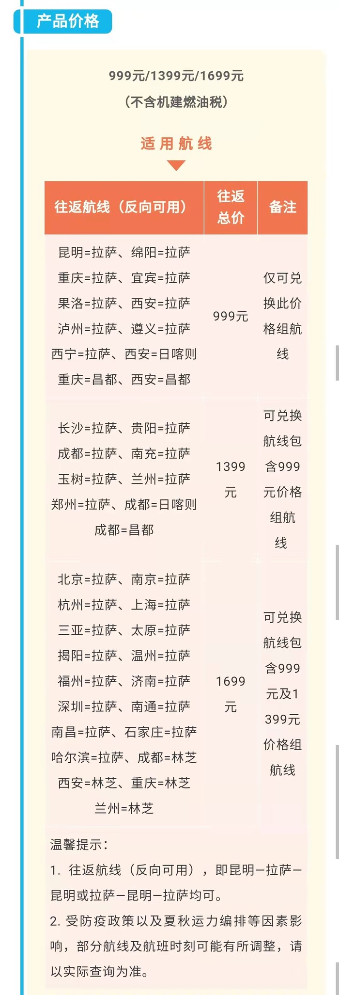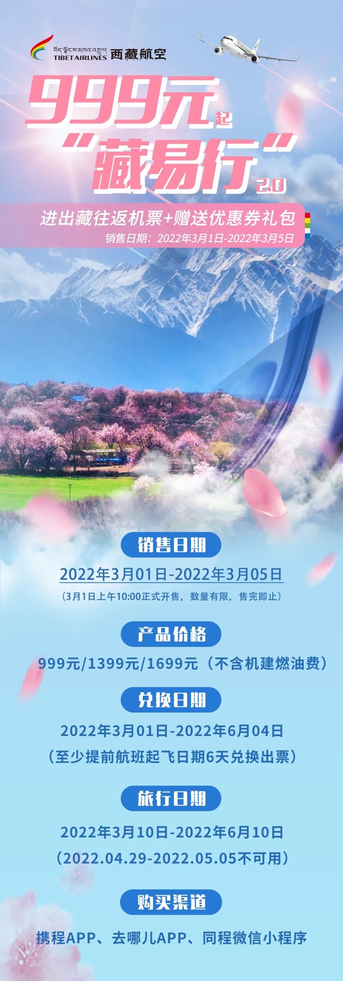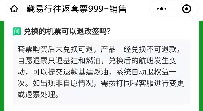西藏航空“藏易行”套票,可兑换一套往返机票,全国多地进出西藏可用。价格999元起,机票税费另付。完全未使用,可以退。