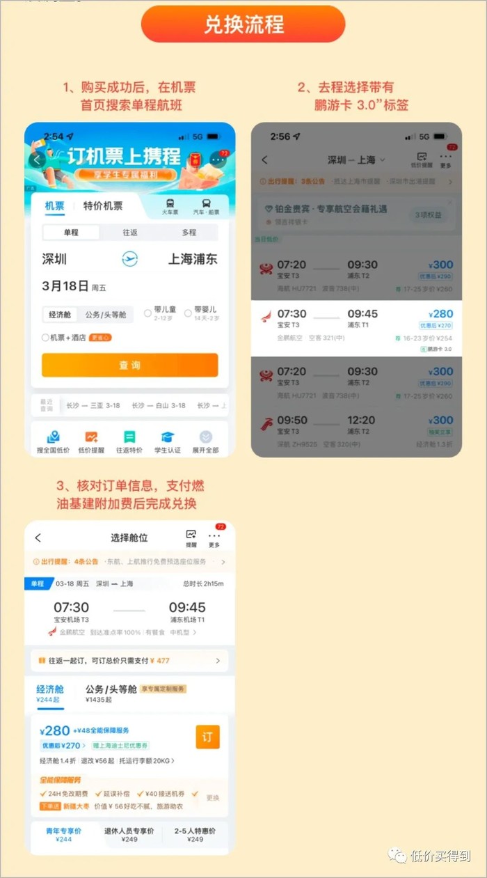 这个卡实际是在携程渠道购买的,兑换日期开始后,在携程APP搜索单程机票,找到带有“鹏游卡3.0”标签的航班,进行兑票。