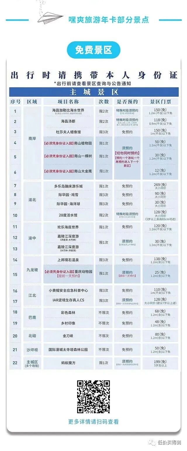 年卡用户可享重庆50多家景区免门票权益(景区内的交通、索道需另付费)。