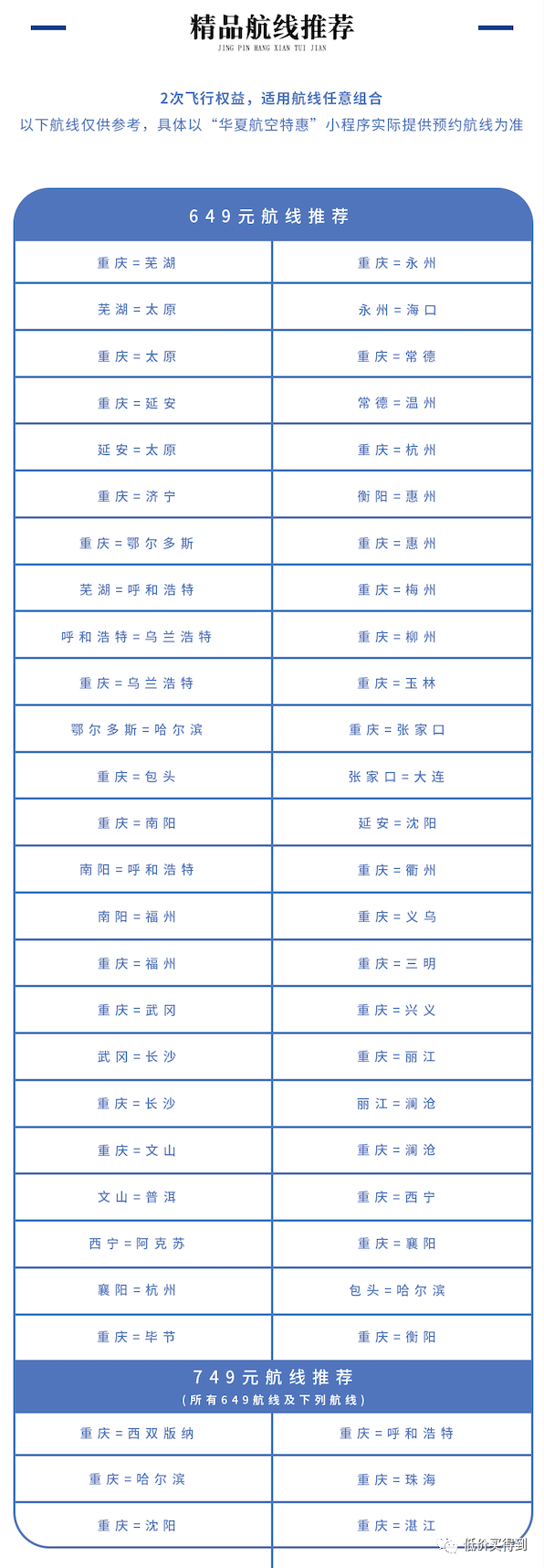 华夏航空2次机票次卡,价格649元起,送重庆旅游年卡。可兑换2张机票(去程+回程、或者两张单程票都可以),在适用范围内任选航线,税费另付,不含免费行李托运额。