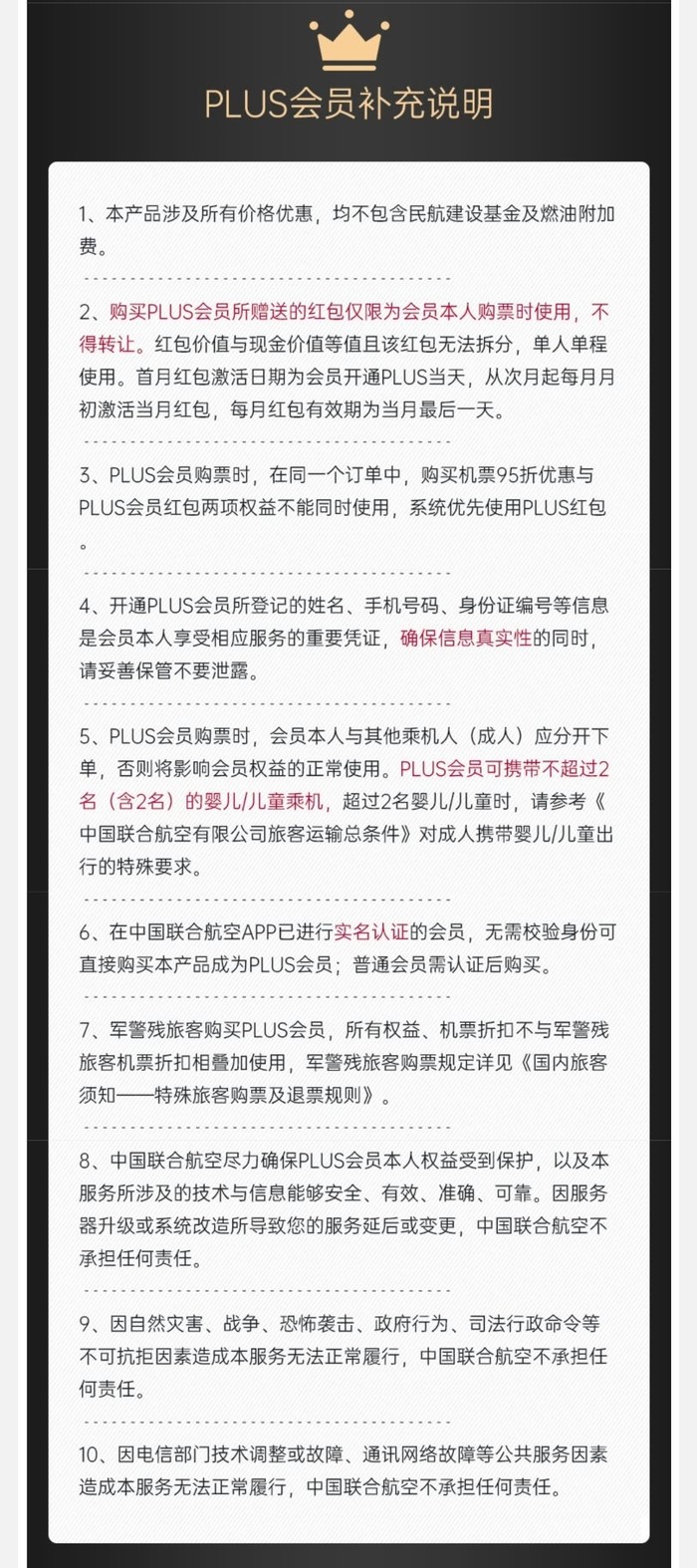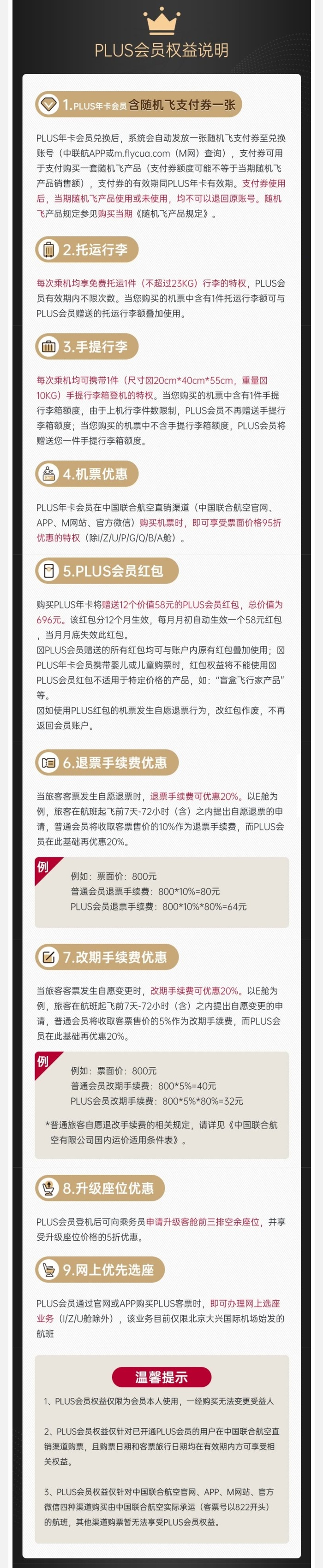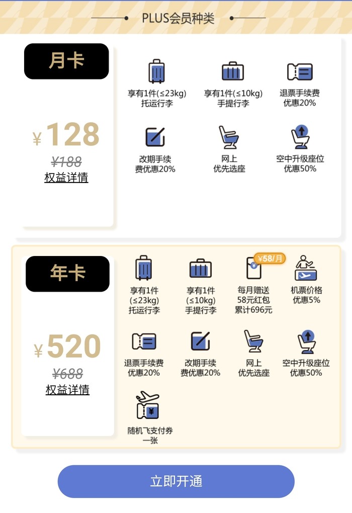 中国联合航空plus月卡(128元)、plus年卡(520元),有效期内每次乘机享免费托运1件(不超过23kg),买plus年卡还送“随机飞”支付券一张。
