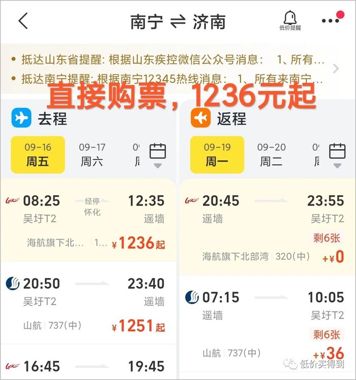 南宁往返济南,直接购票1236元起,往返次卡698元,便宜 530元起。