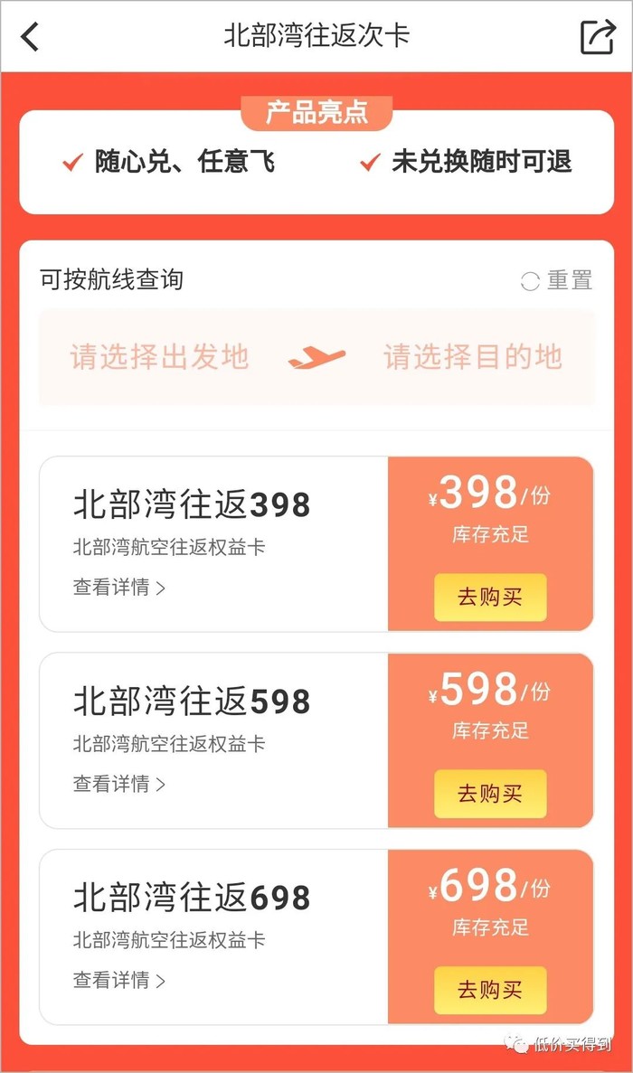 北部湾航空往返次卡,有 398元/套、598元/套、698元/套 三个价位,每套可兑换往返机票1套,税费另付。