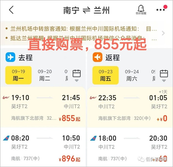 南宁往返兰州,直接购票855元起,往返次卡598元,便宜 255元起。