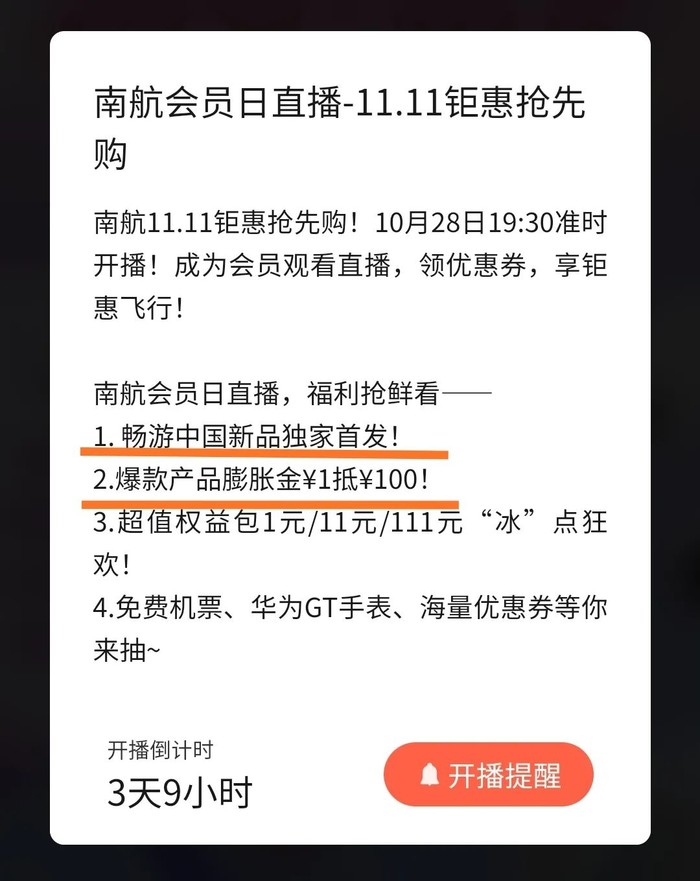3、10.28 19:30在南航微信小程序直播间会首发畅游中国新品。