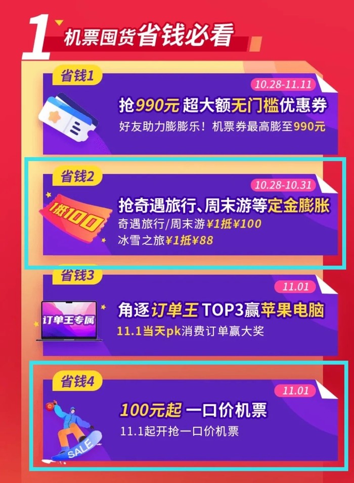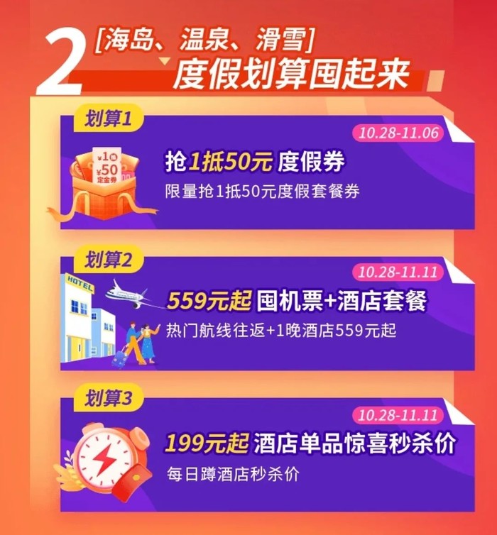 4、10.28~11.11,上线机酒套餐、度假优惠券、酒店惊喜价秒杀