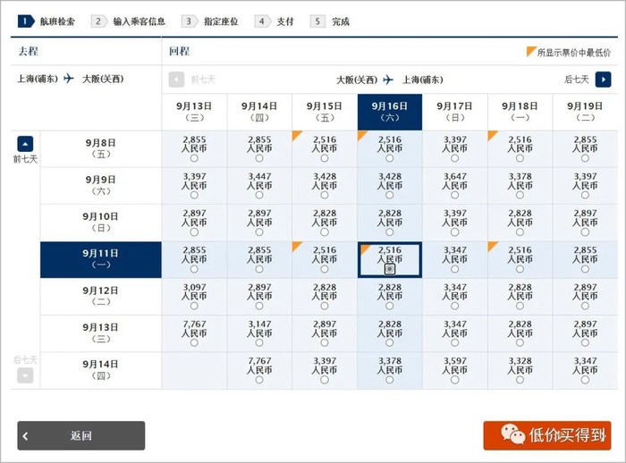 在全日空官网购票时,利用价格日历,找低价很方便。实测的这些航线从9月起更容易找到低价。