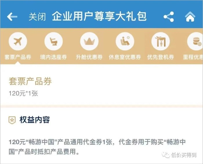 如果大家已经在南航APP进行过企业认证,有机会领120块套票代金券,买“畅游中国”抵扣120元。