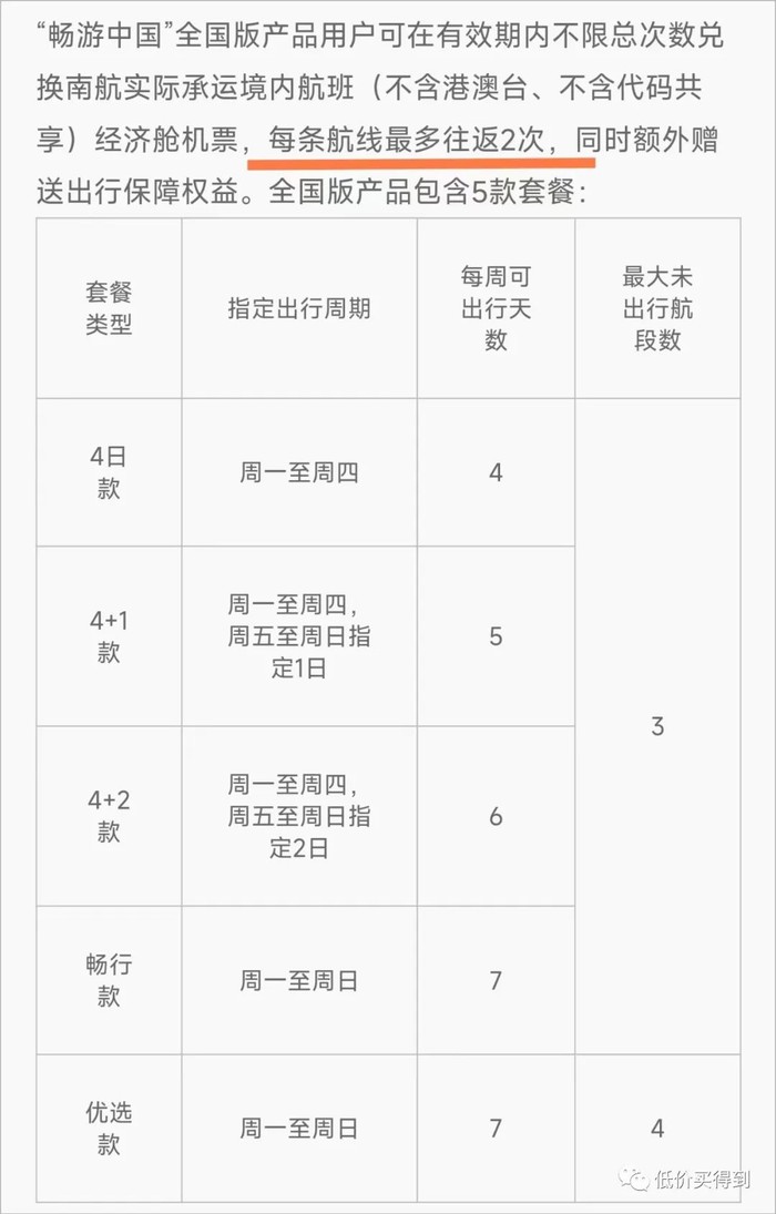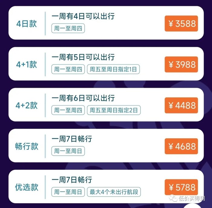 全国版一共分为5个版本,区别在于每周可飞行次数,以及最大未出行航段数。最大未出行航段数越多,你提前可兑换的机票数量就越多,便于提前锁定热门时段的机票。