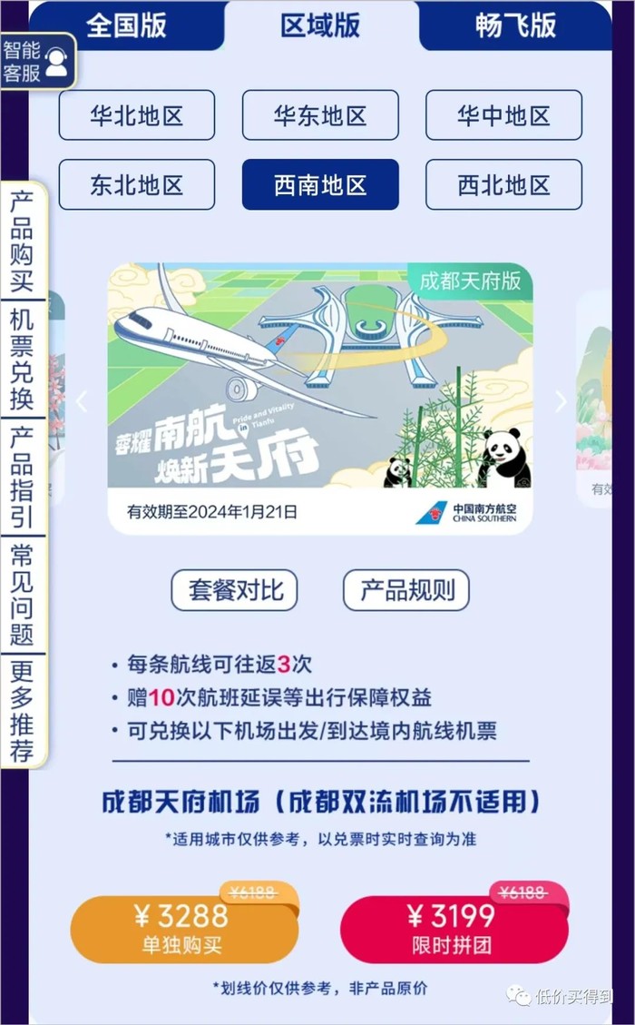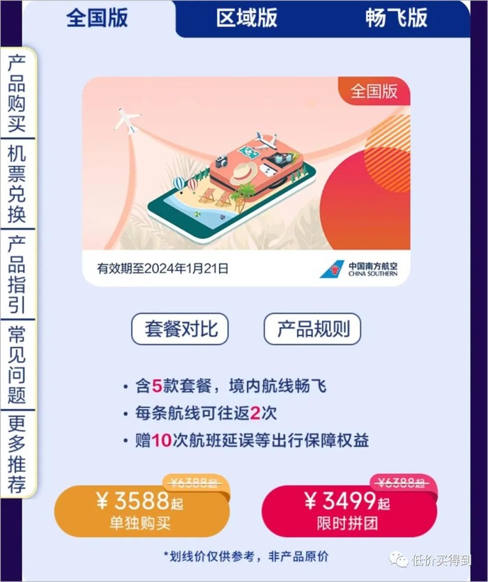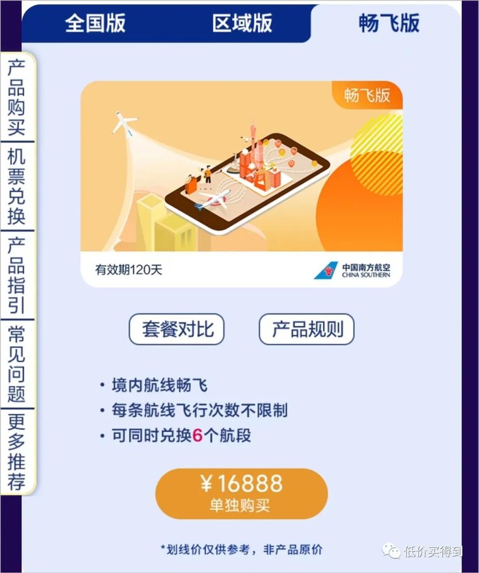 分为全国版、区域版、畅飞版,3199元起/套(这只是起步价)。购买之后,南航境内航线不限总次数飞行,每次兑换机票需额外支付20元+机票税费(目前国内800公里以上航线单程税费160元)。