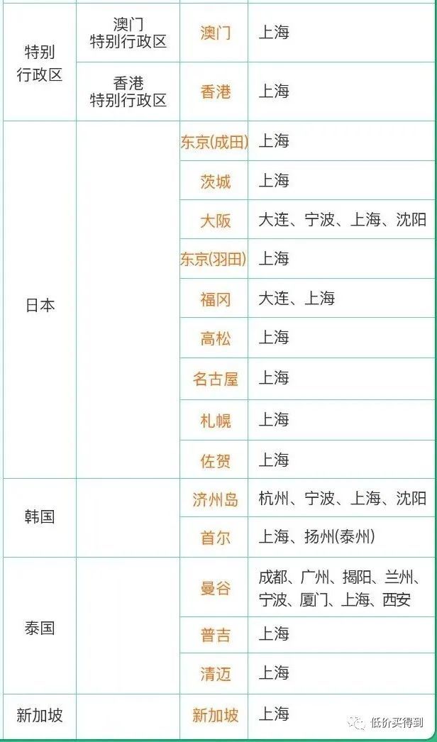 春秋航空中国香港澳门、以及其他国家地区航线: