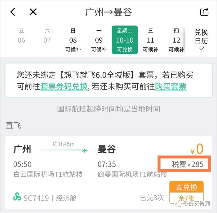 广州飞曼谷,付285元税费。