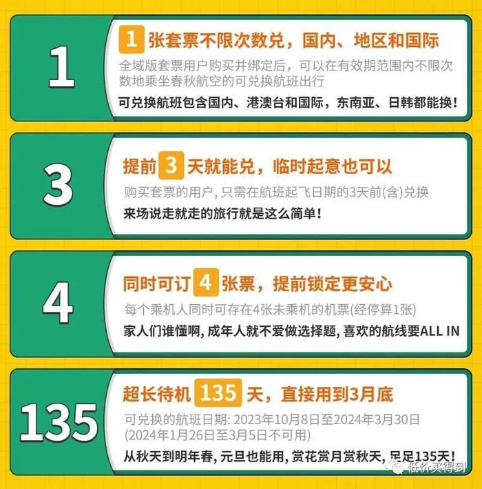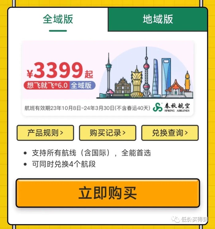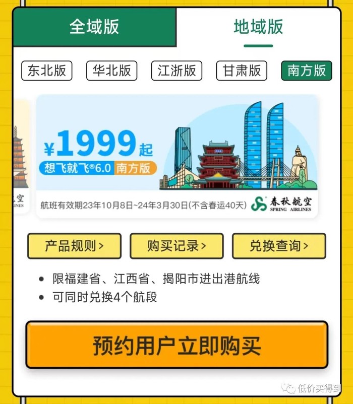 春秋航空的无限飞产品——想飞就飞6.0也开卖了!分为全域版、地域版,有亲子款(儿童可用),在春秋航空APP购买。暂不确定下架时间。