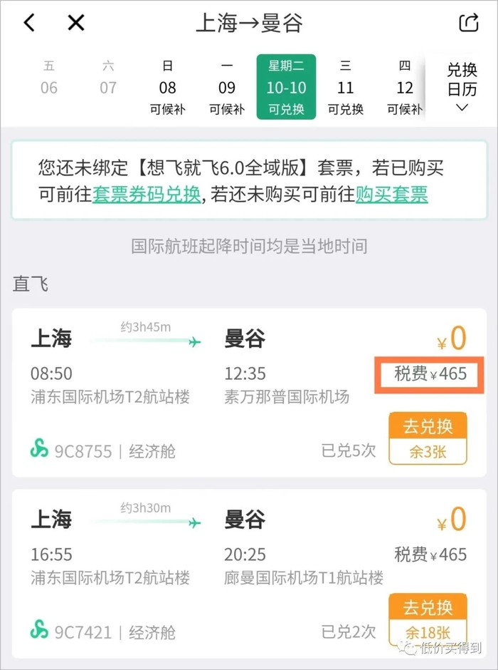 购买【全域版】后,兑换上海飞曼谷机票,付465元税费。