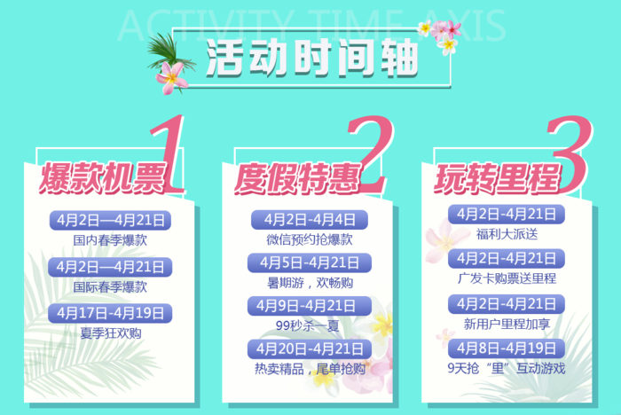 本次活动主要分为爆款机票、度假特惠、玩转里程,活动时间如下图。