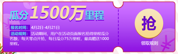 重点:每天0点开抢,最高可以得1000里程,这个活动一直持续到4月21日,每天都可以去领下,还是蛮不错的,里程攒着可以换换国内线机票~