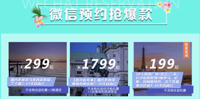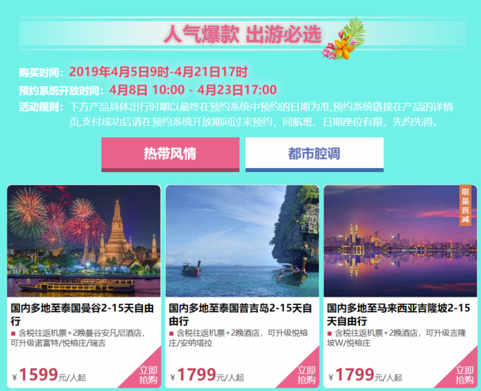 ④各类旅游套餐活动,注意看含税总价,同时可以跟飞猪/携程里的旅游套餐对比下,小心被套路了哟~