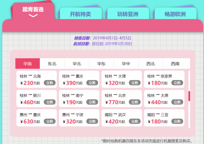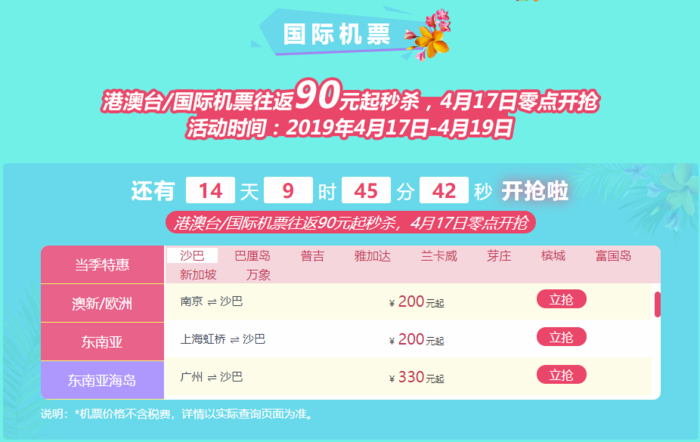 需特别注意:限时抢购机票仅限在本活动页面进行机票搜索及购买。