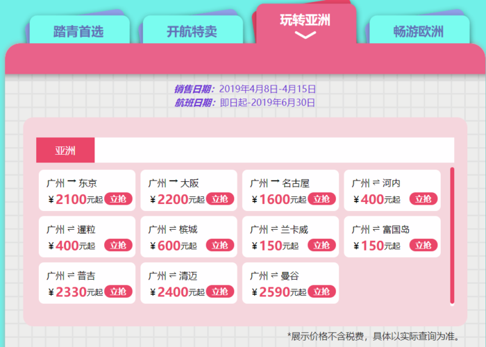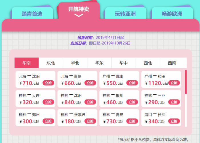 全部航线可前往活动页面查看,活动页面链接:https://www.csair.com/cn/czadscale/2019/20190401_4/index.html?preUrl=HYCFCYJ002&open=1&WT.inner_id=gw-jpkx-lb-190401#querybox