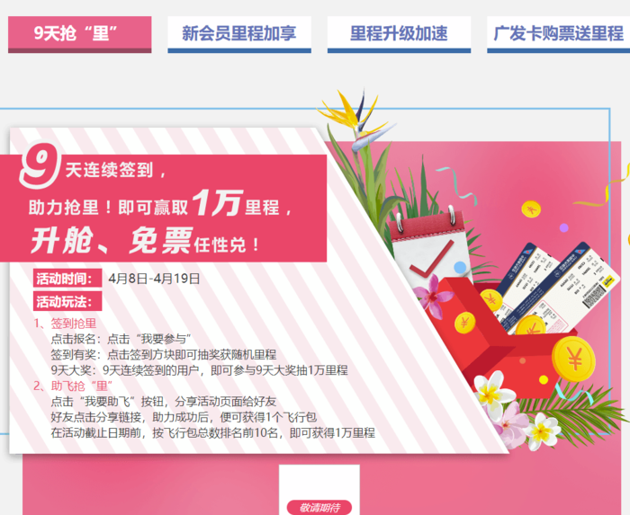 从4月8日开始,连续签到9天,还可以获得抽1w里程的资格。可以参与下~
