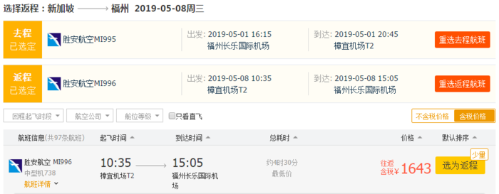 福州=新加坡,五一票,含税1K6直飞往返,有飞猪机票券还能再减40元