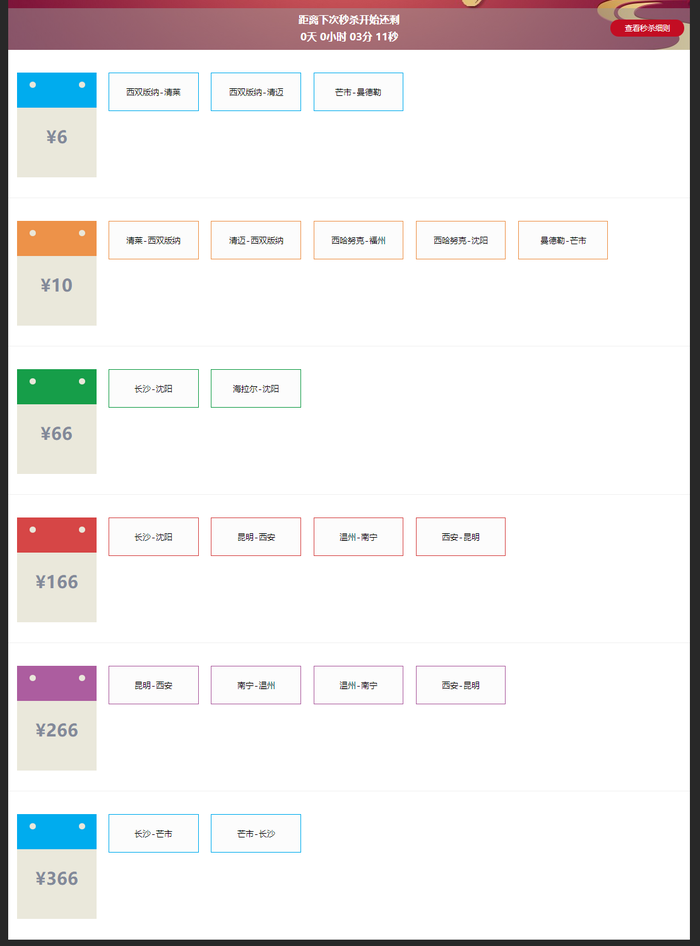 秒杀要求:仅限瑞丽航空官网注册用户,每位注册用户仅能秒杀一次