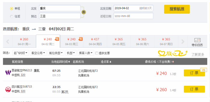 重庆飞三亚,网上搜到比较便宜的价格,含税290元。