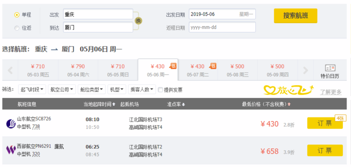 重庆飞厦门,搜到相对便宜的票价,都要400多元,好贵~100多元的秒杀价超级划算!