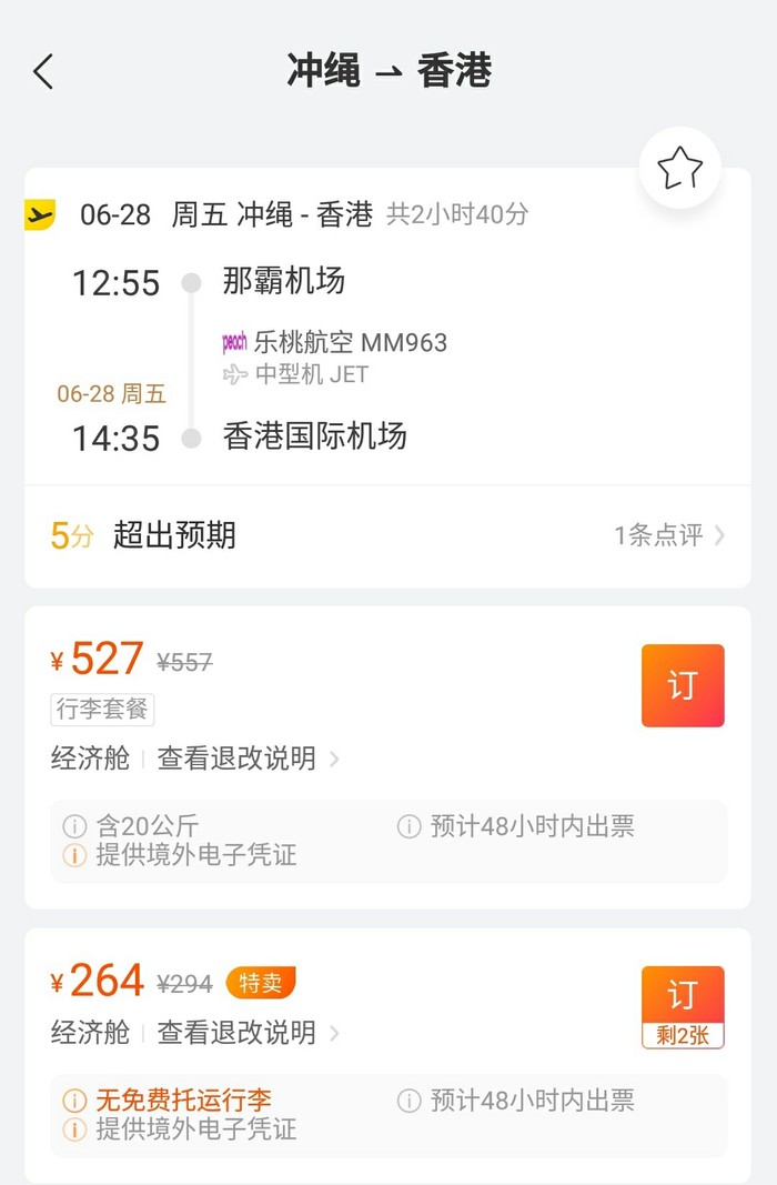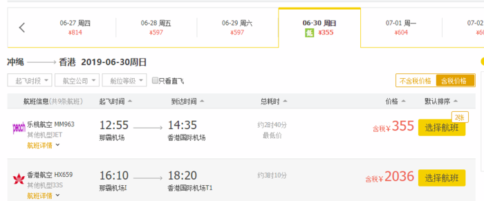 目前已经实测到 冲绳-香港,单程含税264元。