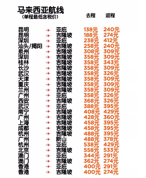 中国城市出发国际航线,单程含税低至138元!