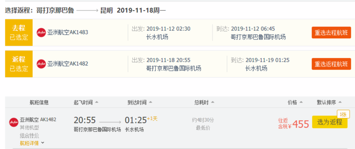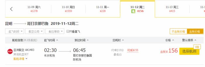 昆明亚庇,单程含税券后101元,往返含税455元